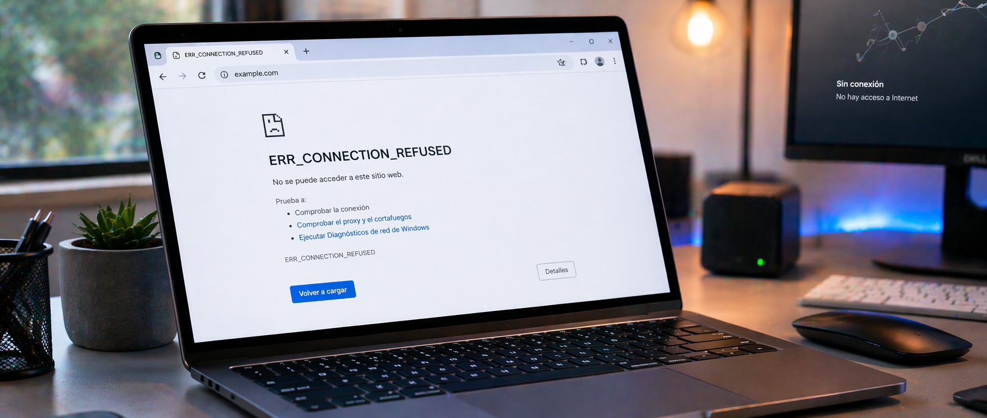 ERR_CONNECTION_REFUSED suele indicar que la comunicación con el servidor fue rechazada y no necesariamente que internet esté caído. Por eso, conviene distinguir si el rechazo ocurre por un bloqueo local o porque la página no está disponible. Esa diferencia ahorra mucho tiempo en el diagnóstico.